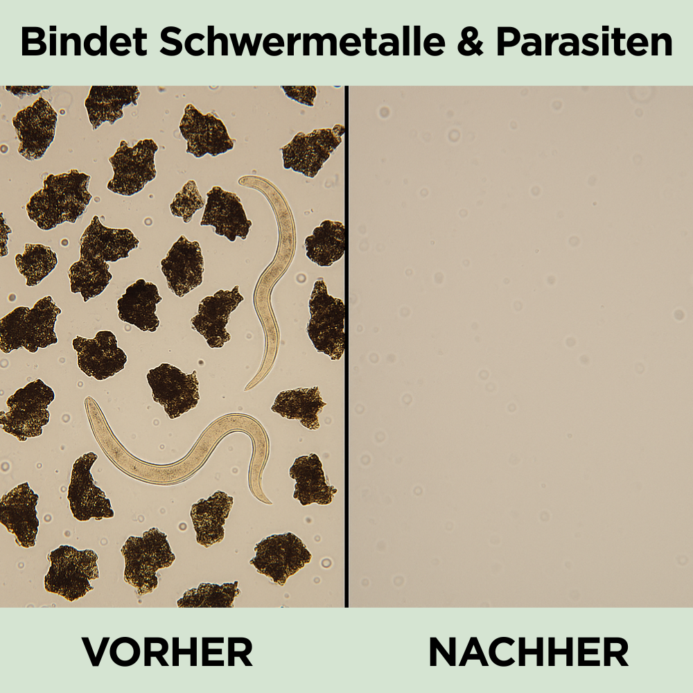 Les minéraux contenus, en particulier la zéolite, fixent les polluants, les résidus de parasites et les métaux lourds dans l'intestin et les éliminent naturellement de l'organisme.
