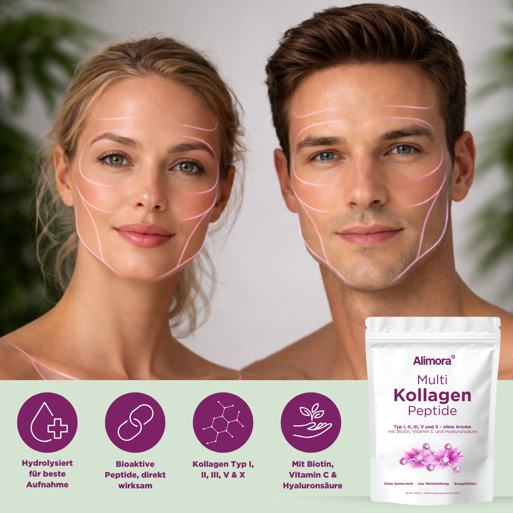 Alimora's Multi Kollagen Peptide haben bereits unzähligen Frauen und Männern geholfen, ihre Haut zu straffen, Falten zu glätten und endlich wieder frisch und vital auszusehen.